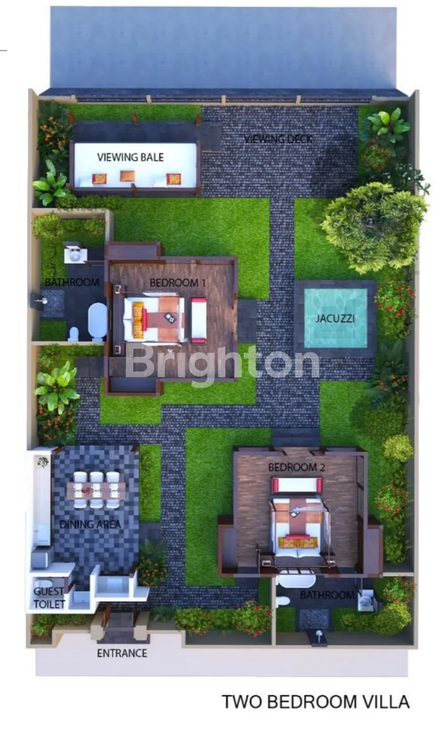 Villa yang berada dalam kawasan Resort seluas 4,2 Ha KDB 10 % dikelilingi area hijau yang luas dan pemandangan lembah dan laut celukan bawang yang indah.