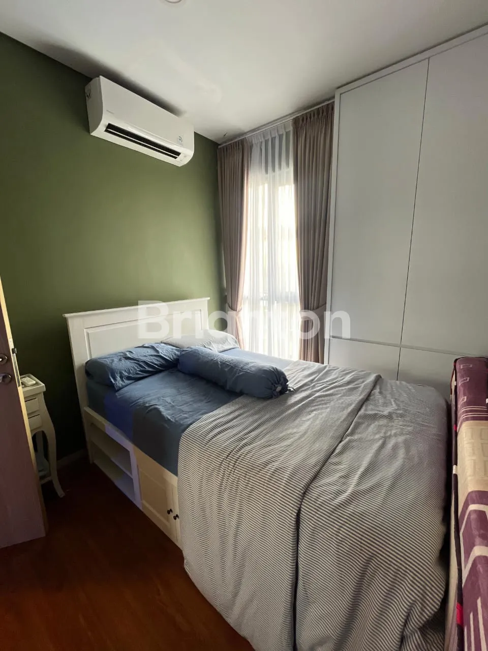 1 Kamar Tidur dengan Springbed Sorong, AC, meja nakas kecil, lemari, korden, Lantai Vinyl Kayu
