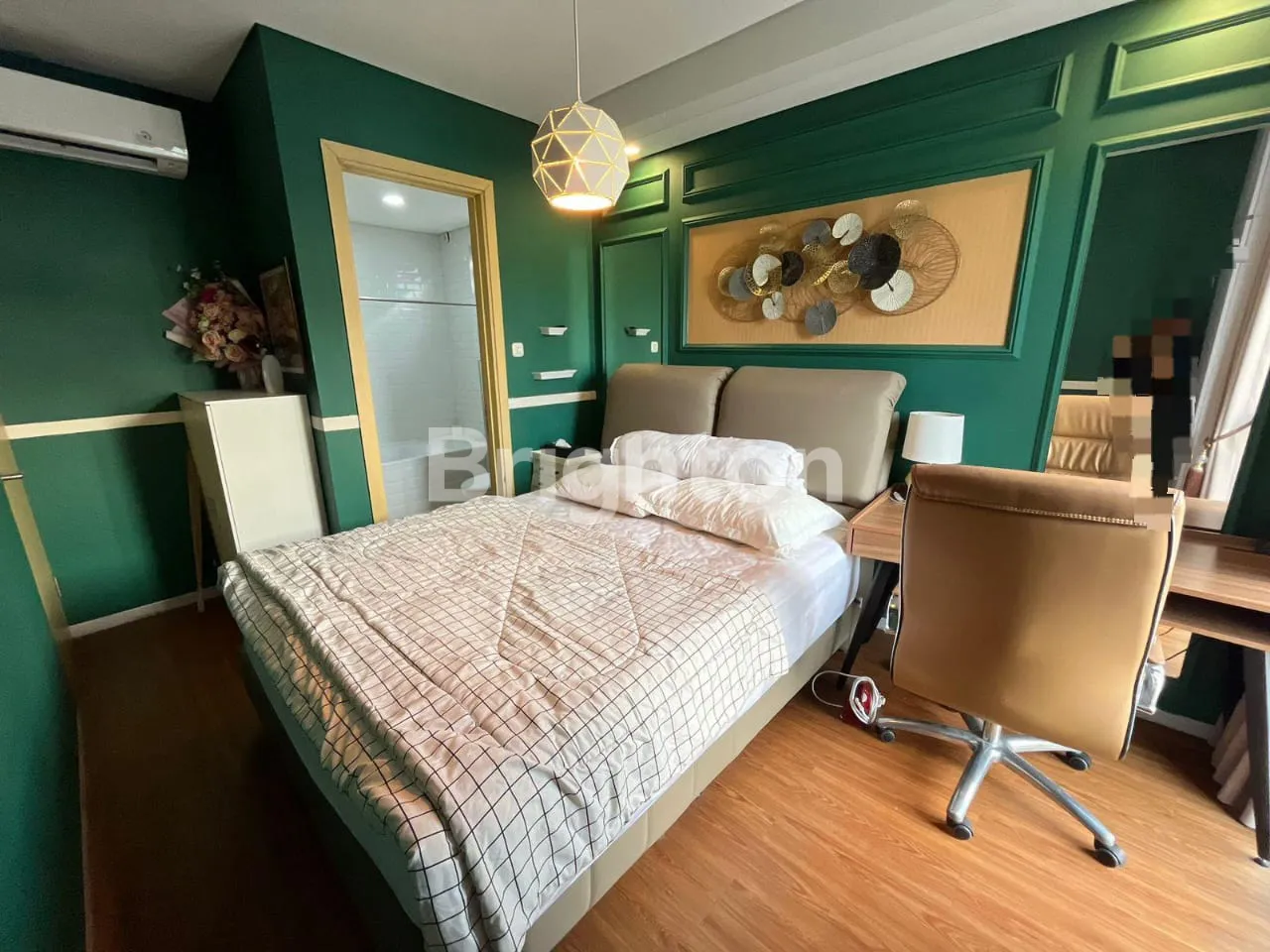 1 Kamar Tidur Utama lengkap dengan Springbed, AC, Korden, Lemari Pakaian dengan banyak Rak, Laci, & Gantungan Baju, Meja Tulis & Kursi, Lampu Hias, Meja Nakas, & Kamar mandi dalam kamar lengkap dengan : Bathtub, Closet duduk, Shower, Cermin, Lantai Vinyl Kayu
