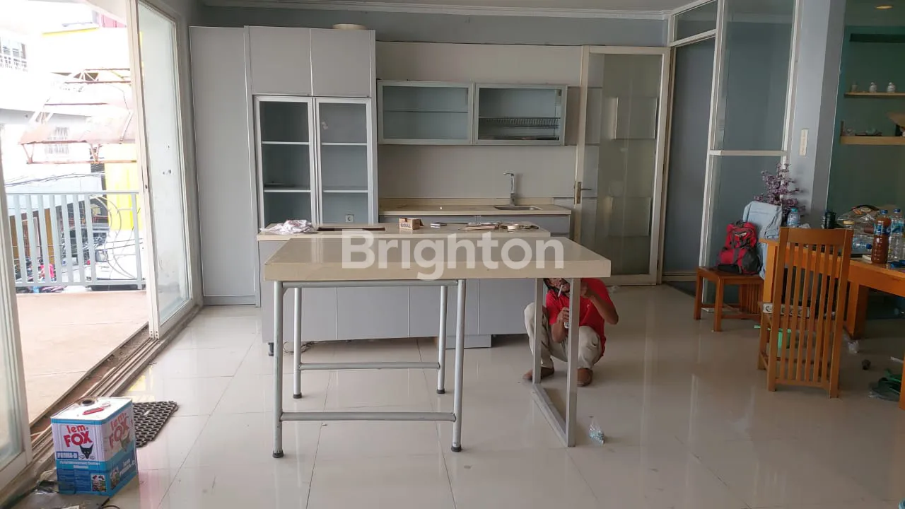 2 ruko Timur + 1 ruko Barat, tangga ke LT#2 hanya ada 1. Ada kitchen dgn cerobong exhaust besar (ex restaurant). L terrace: 1,8*10m.