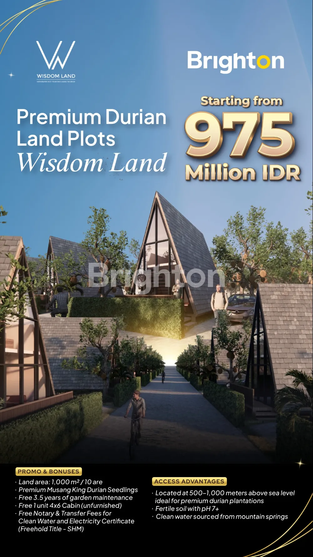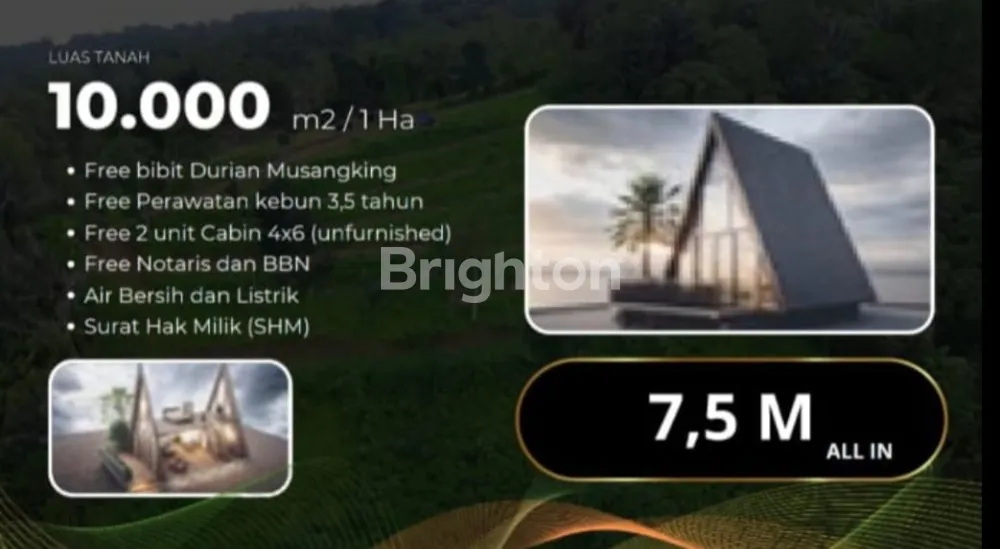 Bonus fasilitas paket: bibit durian (Musang King / varietas unggulan), perawatan kebun selama beberapa tahun, dan cabin (bangunan kecil) sebagai titik wisata atau pusat observasi kebun.
