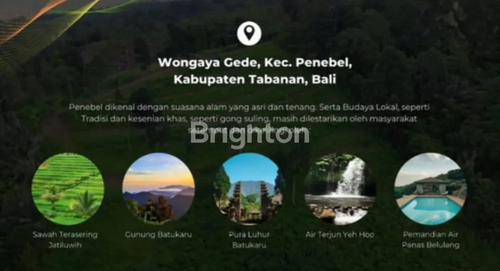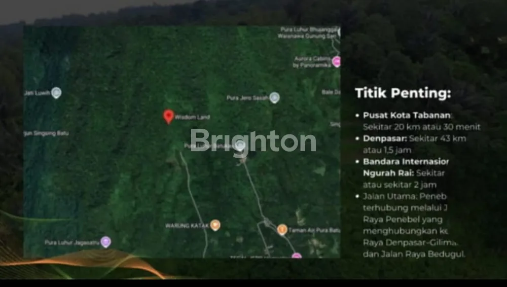 Lokasi & Potensi PasarTabanan, khususnya Penebel, semakin diminati sebagai daerah wisata alam, agritourism, dan perumahan alternatif Bali. Permintaan terhadap lahan pertanian plus titik wisata kreatif meningkat. Wisdom Land berada di wilayah strategis untuk menarik investor lokal dan luar Bali yang mencari peluang properti kombinasional (kavling pertanian + wisata).