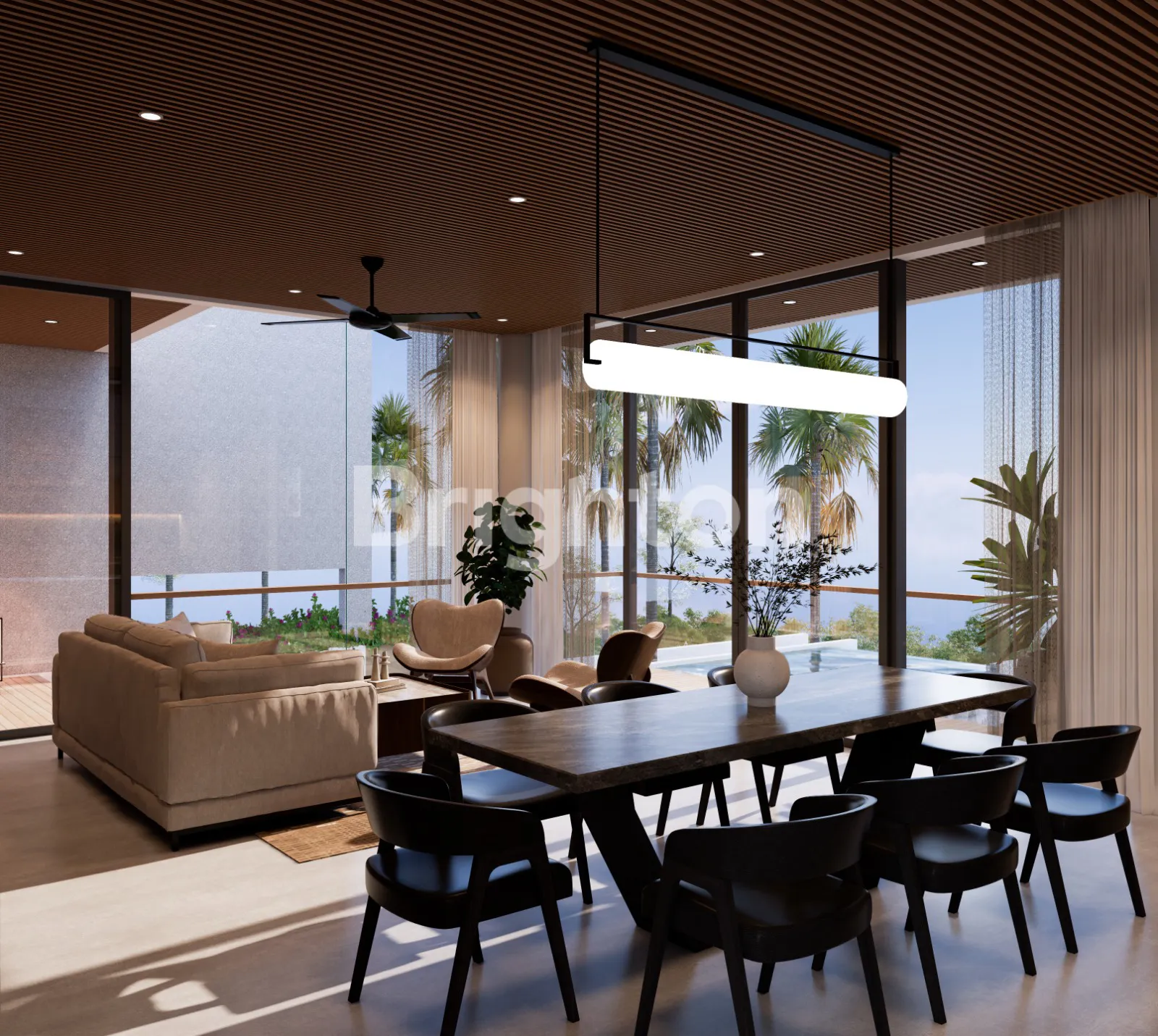 Desain arsitektur modern tropis yang elegan. Di setiap sudutnya dirancang dengan detail agar mampu mengalirkan udara secara alami sehingga membuat suasana nyaman dan bahagia saat berada di rumah. Ditambah dengan pengunaan kaca di setiap sudut yg membuat terasa lebih luas dan aksen layar pada pintu utama dan kolam