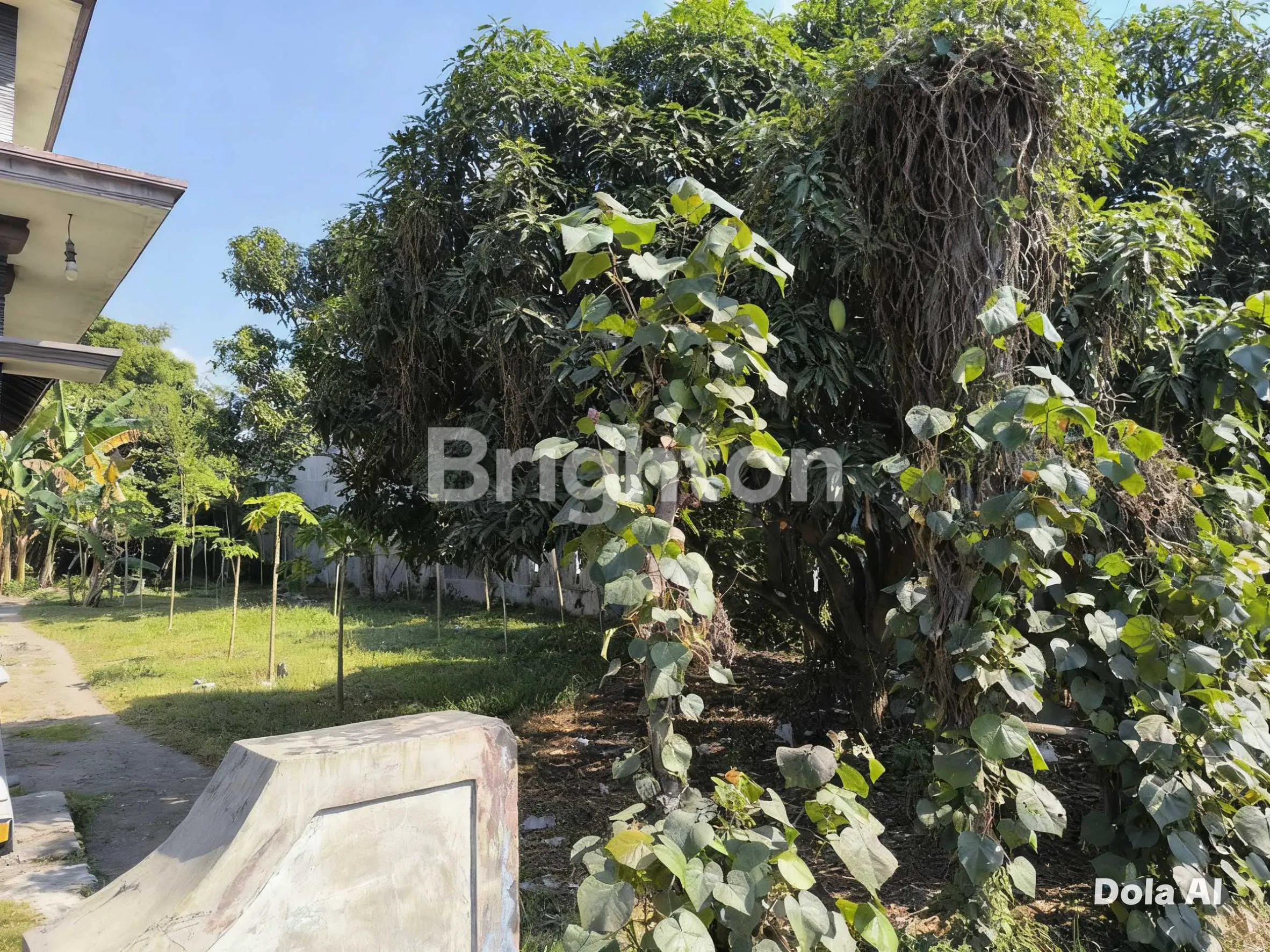 KONDISI TANAH SUBUR & RINDANG: Di atas lahan sudah terdapat pohon besar (seperti pohon mangga) yang memberikan keteduhan alami, membuat suasana lingkungan terasa sejuk dan asri.