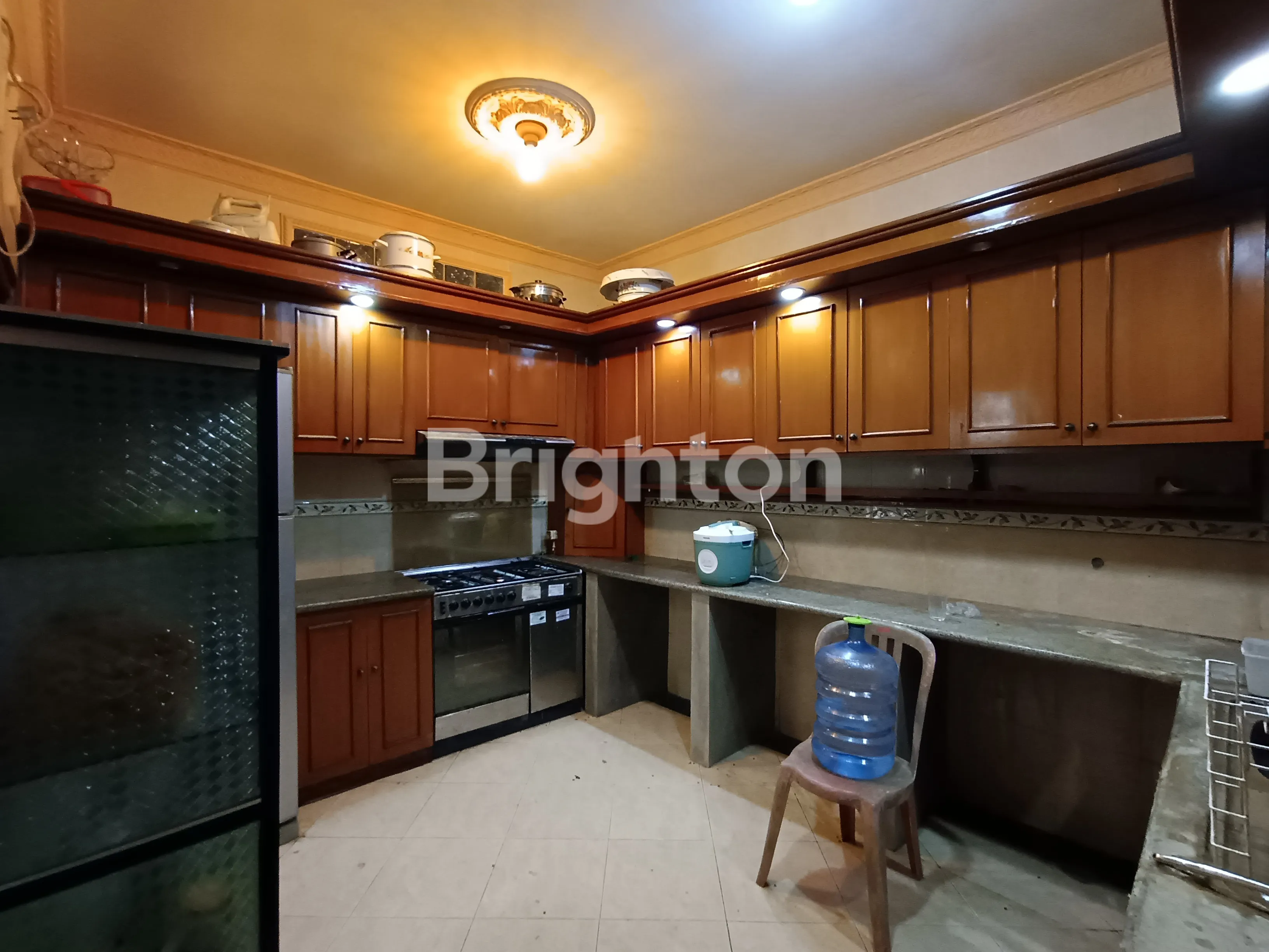 Dapur lengkap dengan kitchen set, kompor, dan kabinet ruang tamu