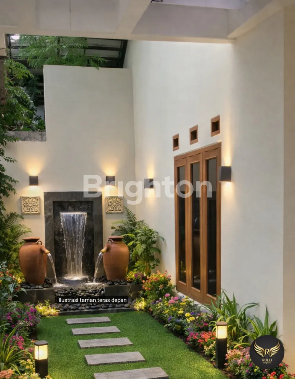 Terdapat area terbuka di bagian depan yang bisa didesain ulang dengan ornamen dinding batu alam dan kolam mini/taman kecil, sangat pas untuk tempat bersantai keluarga.