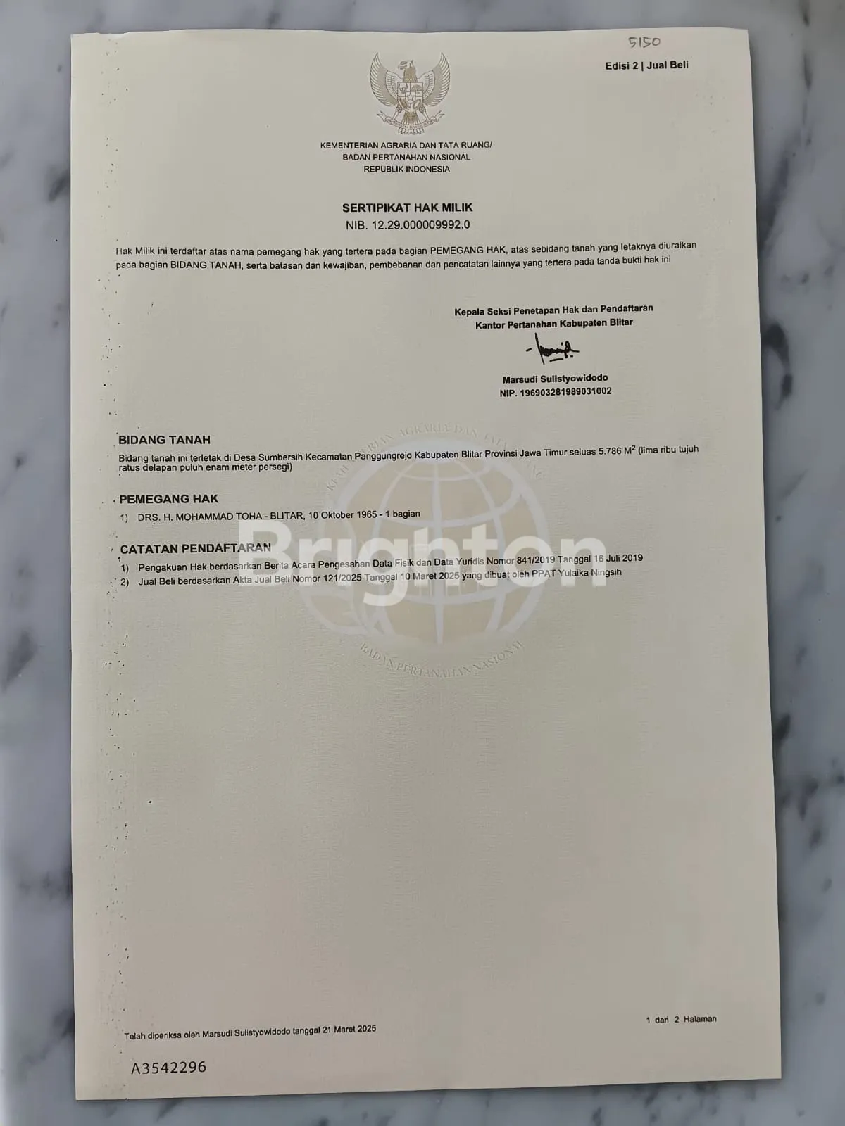 SHM luas 5.786 m2 adalah Rp. 600 rb per m2 ,