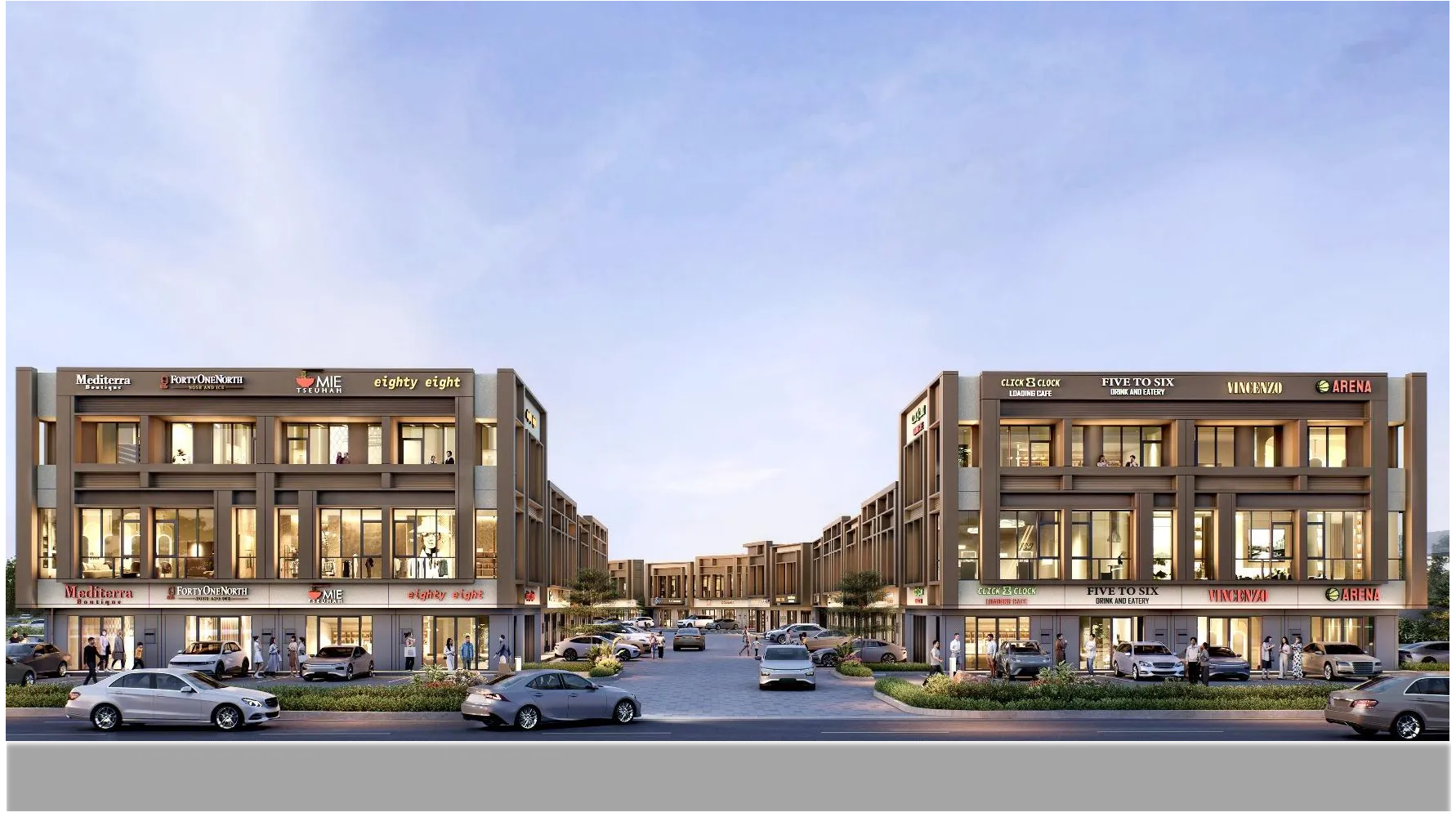 Area komersial dengan multiple access entrance, pedestrian friendly, dan area parkir double layer dengan kapasitas 300+ kendaraan.