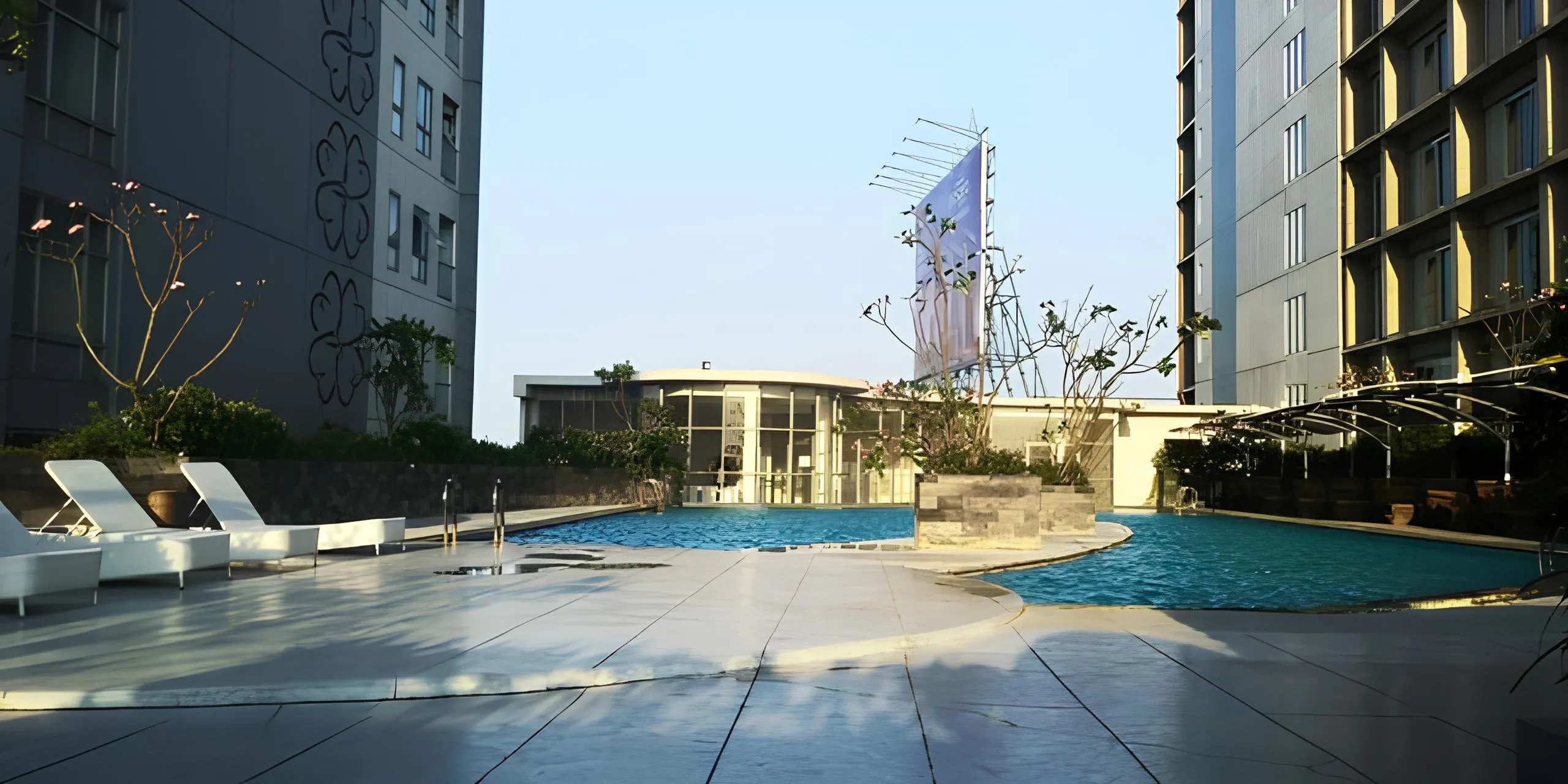 Fasilitas lengkap seperti kolam renang, pusat kebugaran, food court, dan area parkir luas