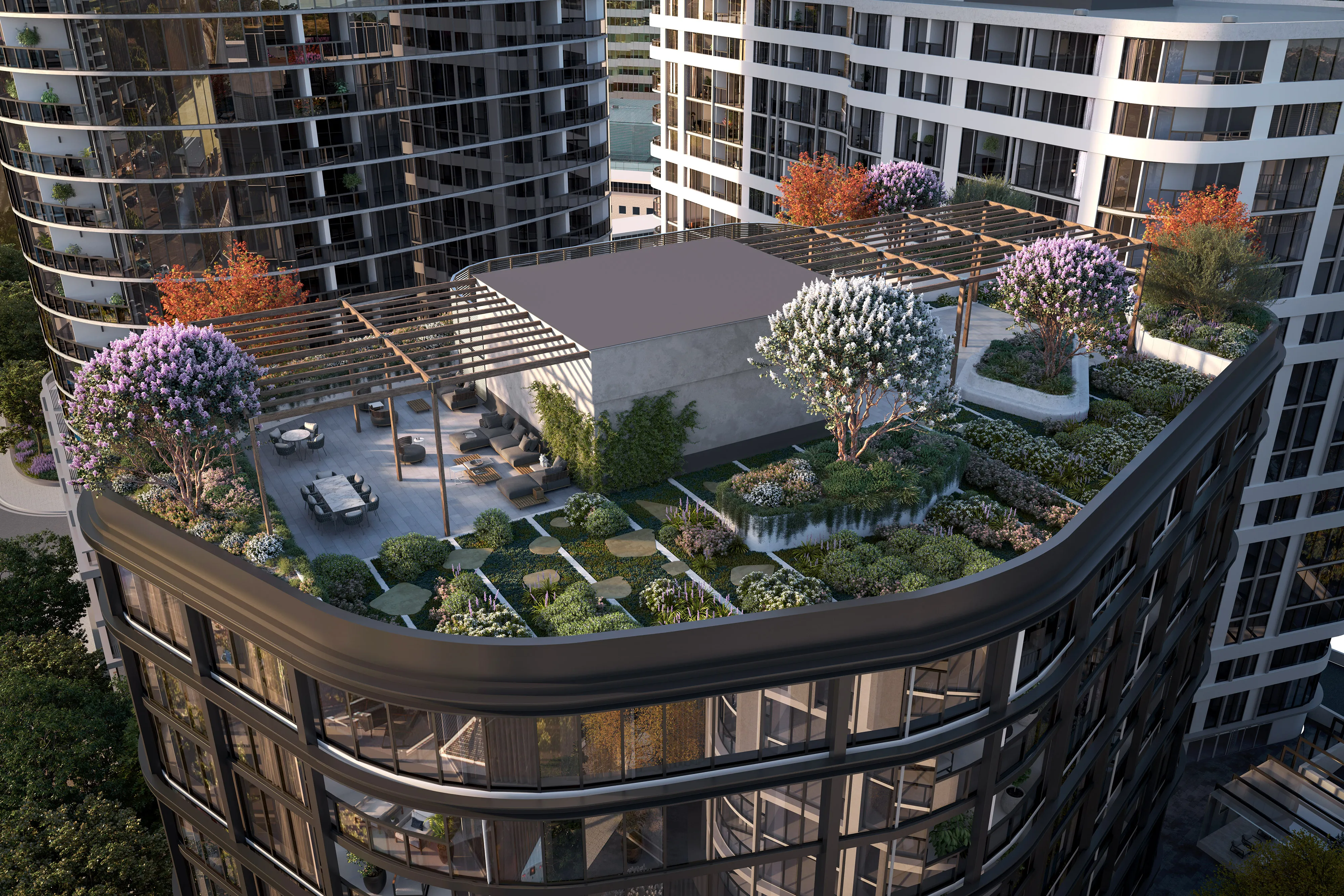 - Lounge atap dengan pemandangan menakjubkan, lounge klub penghuni, dan ruang makan eksklusif.